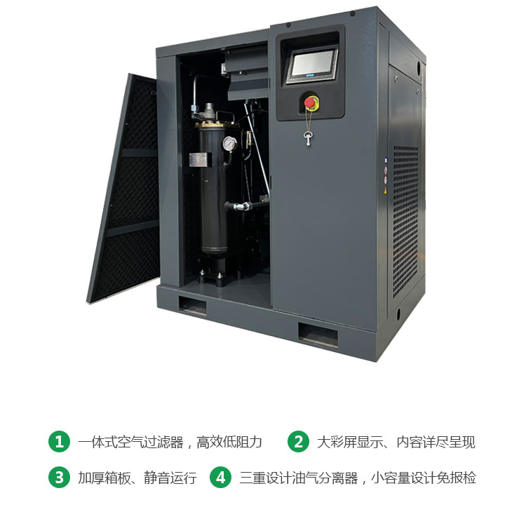 空壓機整機能效高于國家一級能效標準,每產一立方的氣比行業大部分機器用電量少,氣量足,比行業基準多10%,適應惡劣工況條件,按24小時滿載運行設計制造,將機械和電器完美融合。